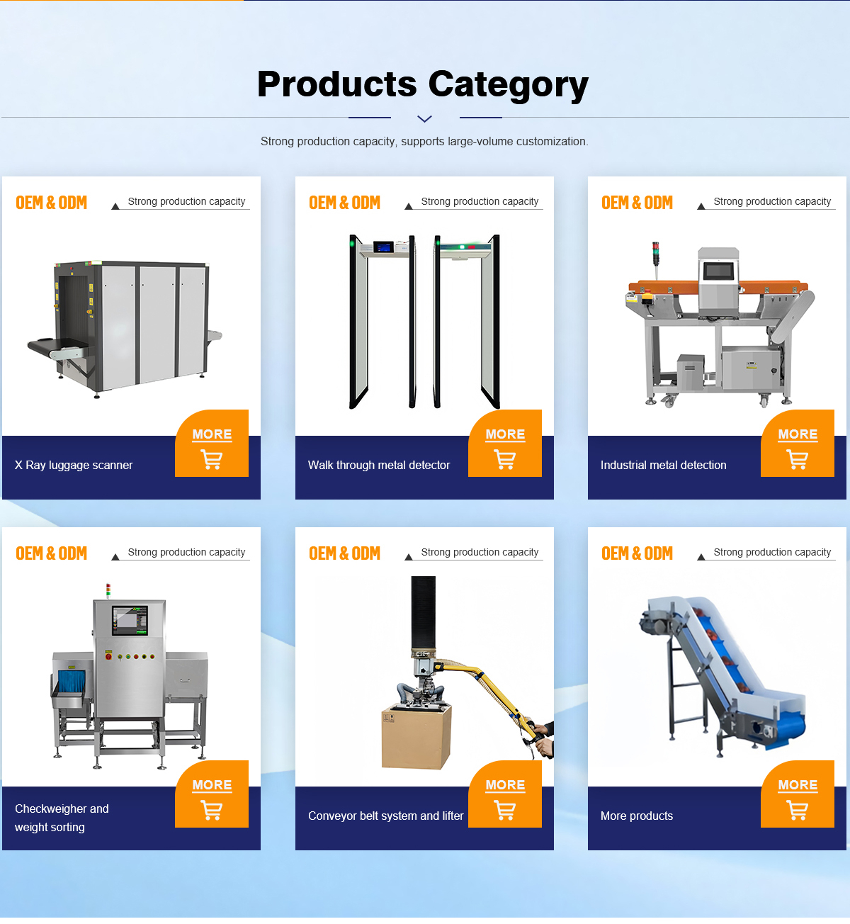 Main categories: Metal Detector, X-ray Baggage Scanners, Glass Lifter, Checkweigher, Industrial Metal Detector